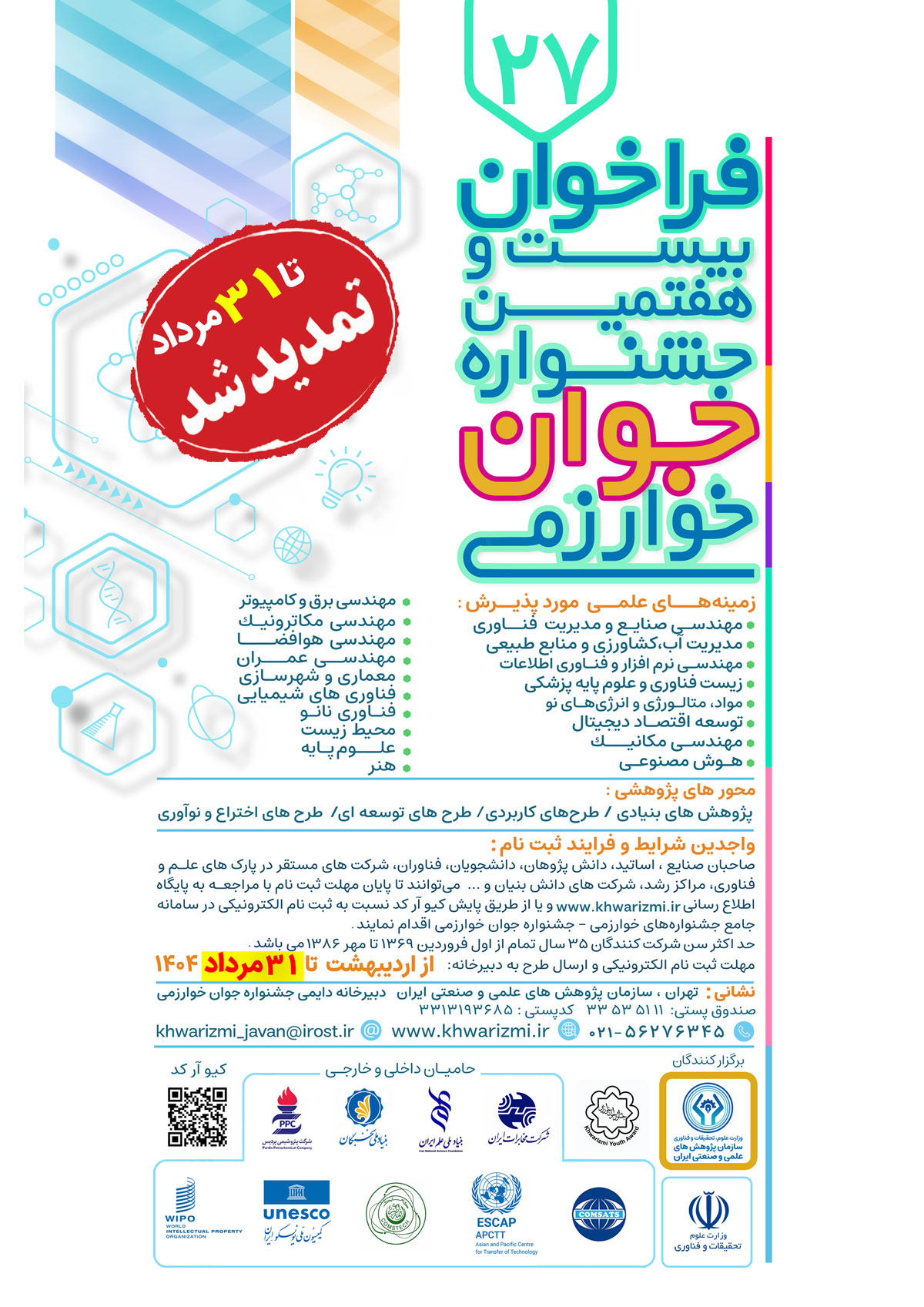 مهلت ثبت نام و تکمیل مستندات طرح بیست و هفتمین جشنواره جوان خوارزمی تا 31 مرداد 1404 تمدید شد.